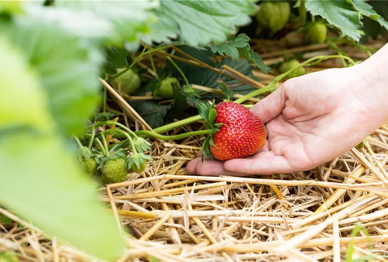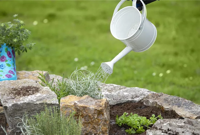 Im Laufe des Jahres muss der Naschgarten aber auch gepflegt werden, damit er gedeiht. Allem voran steht das Giessen. Je grösser die Gefässe, umso geringer ist die Verdunstung. Daher muss ein Naschgarten im Hochbeet im Sommer einmal täglich gewässert werden, Pflanzgefässe hingegen benötigen bei hohen Temperaturen oft zweimal täglich eine Wassergabe. Damit sich die Giessarbeit in Grenzen hält, ist es ratsam, die Erdoberfläche immer wieder zu mulchen. So verringert sich nicht nur die Verdunstung, auch der Unkrautwuchs sinkt erheblich. Während einige Pflanzen im Gartenjahr kaum Pflege benötigen, müssen andere regelmässig hochgebunden oder ausgelichtet werden, damit ausreichend Licht zu allen Pflanzen vordringt. Vor allem starkzehrende Kulturen sind auch über regelmässige Düngergaben sehr dankbar und quittieren diese mit einer üppigen Fruchtbildung. Wenn sich die Gartensaison dem Ende neigt, sollten mehrjährige Pflanzen einen Winterschutz erhalten. Dadurch sind sie vor eisigen Temperaturen und winterlicher Verdunstung geschützt und können im Frühjahr wieder neue Freude bringen.
