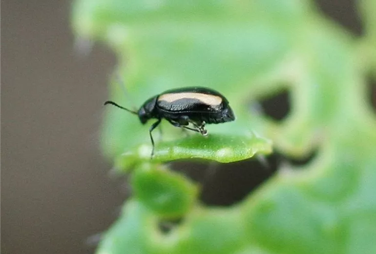 Bei genauerem Hinschauen erkennt man auf Blättern und Boden sehr kleine schwarze oder gelbgestreifte Käfer, die auffällig gut springen können.