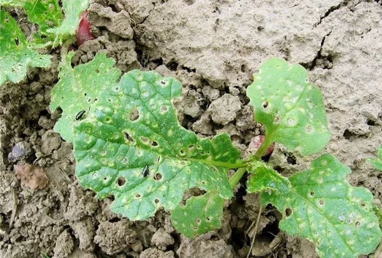 Die ersten jungen Blätter der Rettich oder Radiespflanzen erscheinen siebartig durchlöchert. Vor allem bei warmer Frühjahrswitterung kann es zu erheblichen Schäden kommen, so dass die jungen Pflänzchen sich nicht weiterentwickeln.