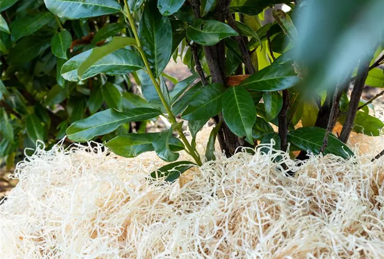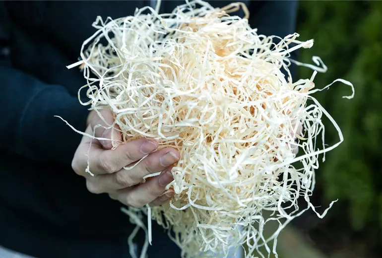 Nicht zuletzt wird Gartenholzwolle auch aufgrund der speziellen Struktur gerne für empfindliche Pflanzen verwendet. Denn einerseits saugen die langen, getrockneten Fasern viel Feuchtigkeit auf, ohne sich direkt zu zersetzen. Andererseits wird auch Luft in den vielen Zwischenräumen gehalten, was vor allem im Hinblick auf eine Isolierung vorteilig ist. Daher können Gärtner und Gärtnerinnen Gartenholzwolle bei dichten, lehmigen und tonhaltigen Böden im Rahmen der Bodenverbesserung einarbeiten. Vor allem im Herbst ist der Effekt umso höher, weil die umgegrabenen Erdschollen aufbrechen und sich dann beim Zerfallen mit der Holzwolle vermengen. Das Resultat ist ein gut belüfteter, speicherfähiger und zugleich durchlässiger Boden, der ideale Wachstumsbedingungen für Pflanzen verschiedenster Art bietet. Auch frostempfindliche Pflanzen können mit Holzwolle gut vor eisigen Temperaturen und schneidenden Winden im Winter geschützt werden. Dazu wird im Spätherbst etwas Hasendraht oder eine Schilfrohrmatte locker um die Stämme der Pflanzen gelegt und in den Zwischenraum die Holzwolle eingefüllt. Fertig ist ein natürlicher Wintermantel.