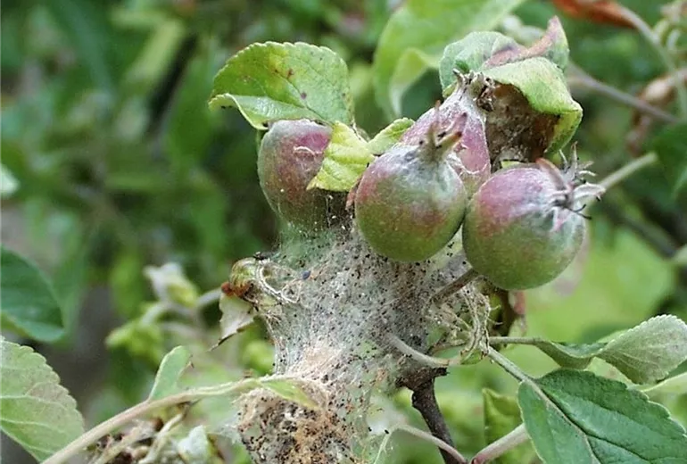 Die Apfelbaumgespinstmotte (Yponomeuta malinella) ist ein kleiner, heller Falter von ca. einem Zentimeter Länge. Die weissen Flügel sind auffällig schwarz gepunktet. Nach vollendeter Larvenentwicklung verpuppen sich die Tiere innerhalb des Gespinstes.