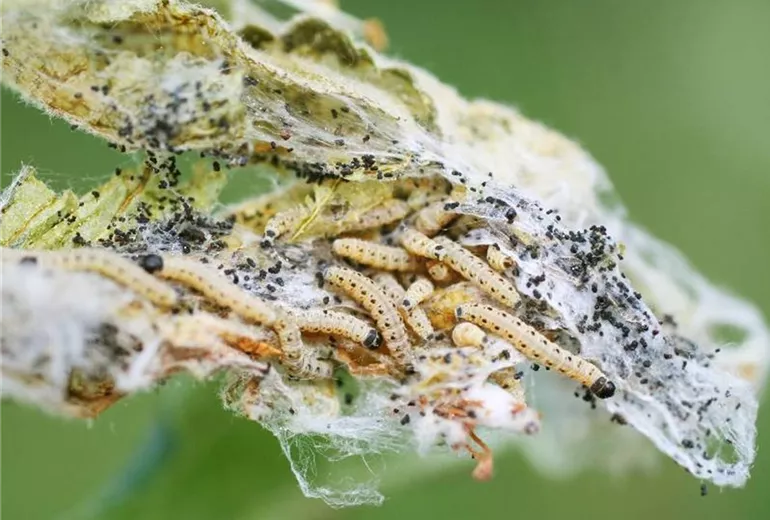 Ausserdem sind die Gespinste mit schwarzen Kotkrümeln übersät. Die Tiere fressen junge Blätter, von denen sie nur die Blattrippen, die sie mit feinen Fäden zusammenspinnen, stehen lassen.