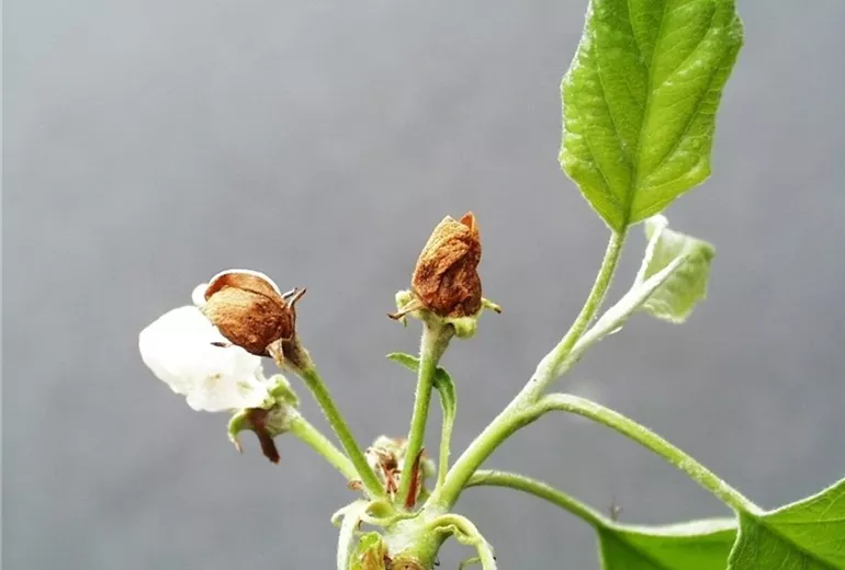 Ein Teil der Apfelblüten öffnet sich nicht. Sie bleiben im Ballonstadium stecken und vertrocknen. In diesen geschlossenen Blüten findet man eine gelbliche, fusslose Larve mit schwarzer Kopfkapsel oder die weissliche Puppe des Schädlings.