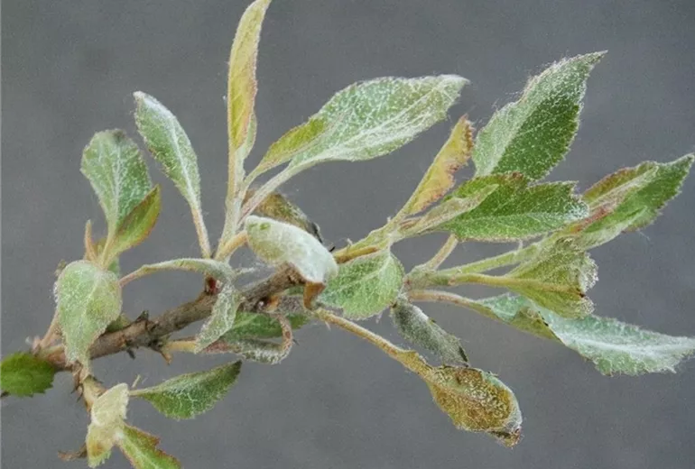 Im Mai und Juni sind die jungen Blätter und Triebe des Apfels, manchmal auch die der Quitte, ganz oder teilweise von einem weissen, mehlartigen Belag überzogen.