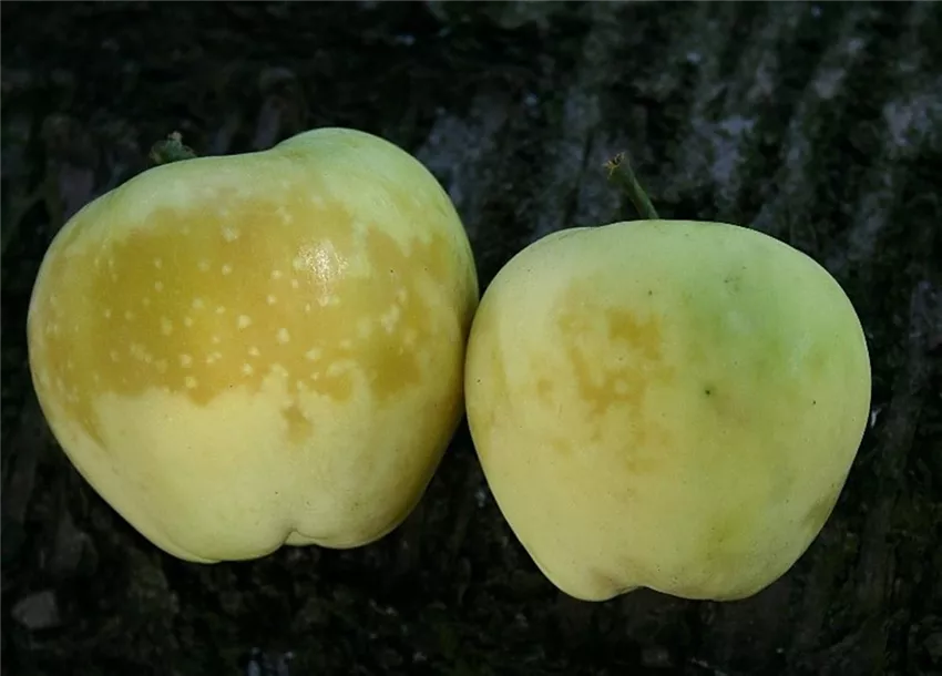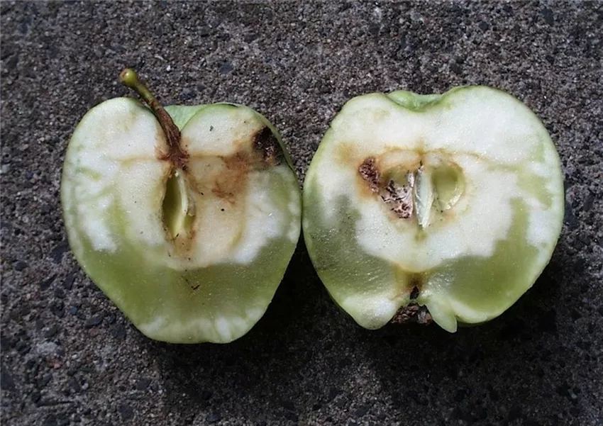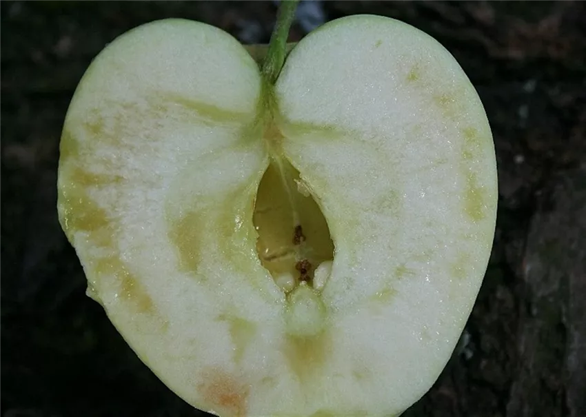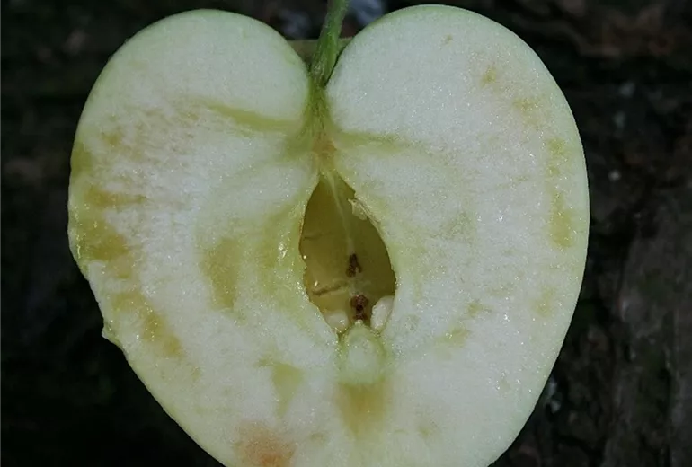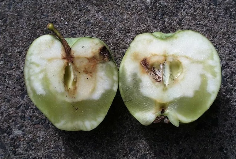 Das Fruchtfleisch erscheint im Bereich des Kernhauses aber auch unterhalb der Schale wässrig und durchscheinend. Im Lager können sich glasige Stellen im Fruchtfleisch zurückbilden, so dass diese Störung meist nur an erntefrischen Äpfeln beobachtet wird.