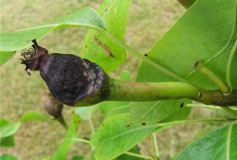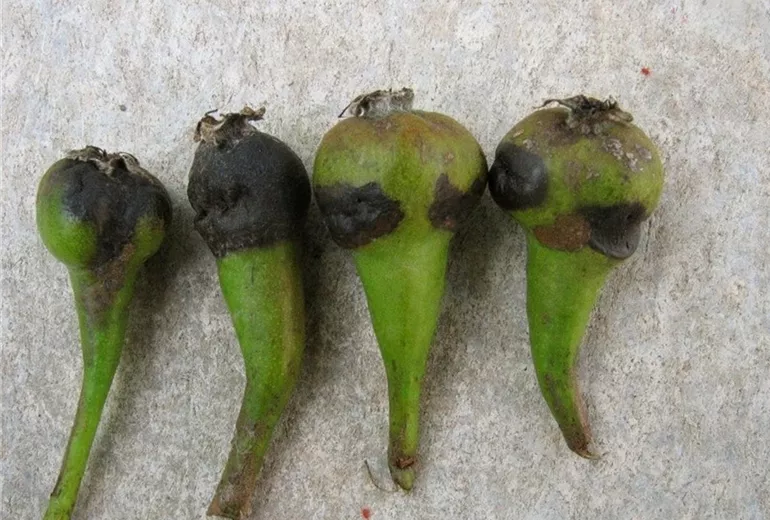 Schwarze Verfärbung der Früchte können auch durch den Birnenschorf oder den Birnenbrand hervorgerufen werden.