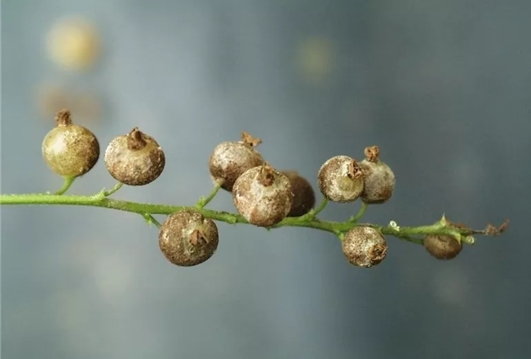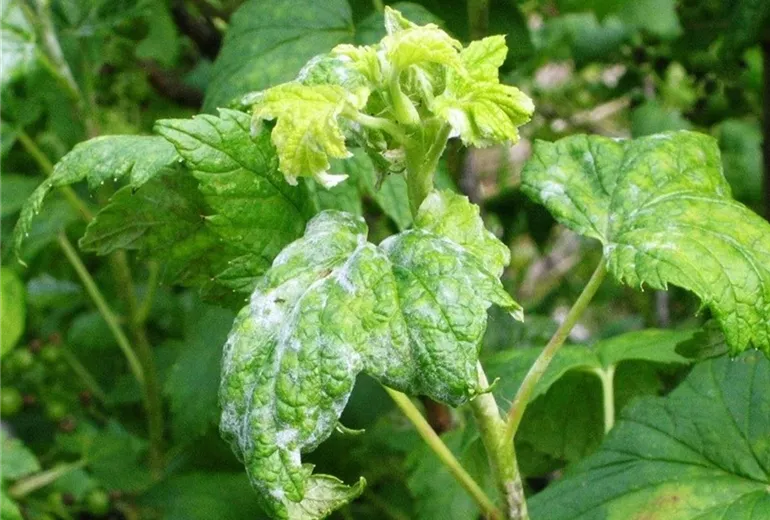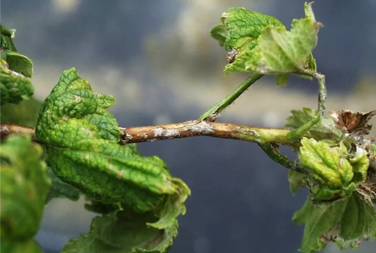 Der an Stachelbeeren bekannte Pilz überzieht im Frühjahr die jungen Triebe mit einem schmutzig-weissen Belag. Im Laufe der Vegetationsperiode verfärben sich diese Beläge schnell braun.