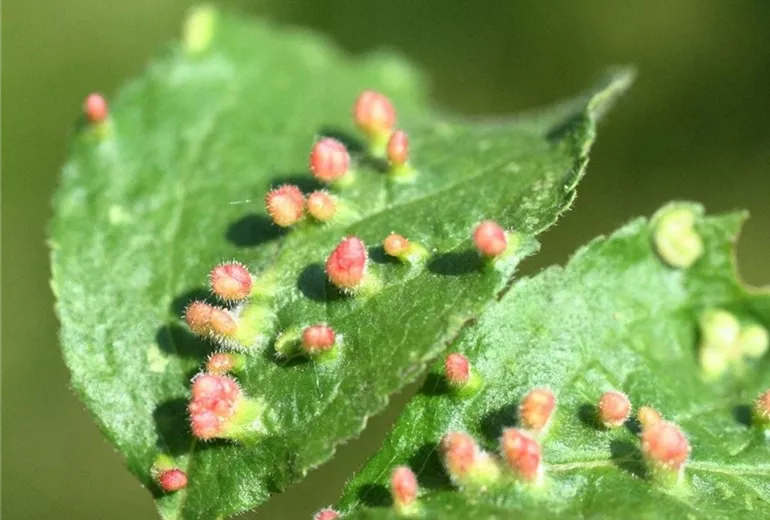 Auf der Blattunterseite, vor allem am Blattrand, bilden sich im Frühjahr anfangs grünliche, beutelförmige Wucherungen (Gallen) von 1 bis 3 mm Grösse, die sich zum Sommer hin rötlich verfärben.