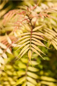 Sorbaria sorbifolia ist sommergrün. Ihre Blätter sind etwa 20 bis 25 cm gross und ihre Farbe ist ein schönes Mittelgrün. Sie treibt relativ früh im Jahr aus.